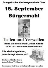 Zum 15.9 2013 lädt unsere Kirchengemeinde wieder zum traditionellen Bürgermahl rund um die Martin-Luther Kirche ein. In zwangloser Runde wollen wir Menschen Gelegenheit bieten, miteinander zu essen, zu trinken und ins Gespräch zu kommen. Tische und Bänke werden kostenlos gestellt.