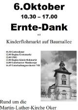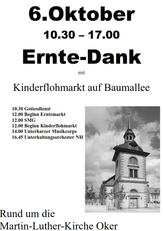 Ablauf:10.30 Gottesdienst12.00 Beginn Erntemarkt12.00 SMG12.00 Beginn Kinderflohmarkt14.00 Unterharzer Musikcorps16.45 Unterhaltungsorchester NH
