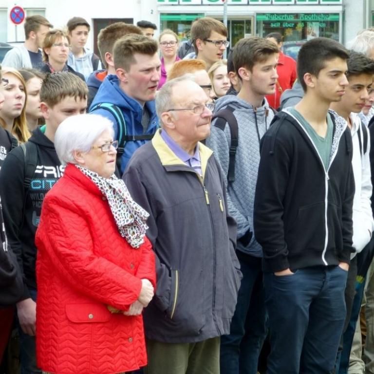 "Wir haben hier einen würdigen Ort gefunden, um an die Geschehnisse vor 70 Jahren zu erinnern", betonte Oberbürgermeister Dr. Oliver Junk bei der Einweihung am Donnerstag vor großem Publikum und resümierte noch einmal das Leben des heute 91-jährigen Andre Mouton, der im Zweiten Weltkrieg aufgrund von Waffenbesitzes von der Gestapo verhaftet wurde. Der Zwangsarbeiter musste die Deportation in mehrere Konzentrationslager über sich ergehen lassen.