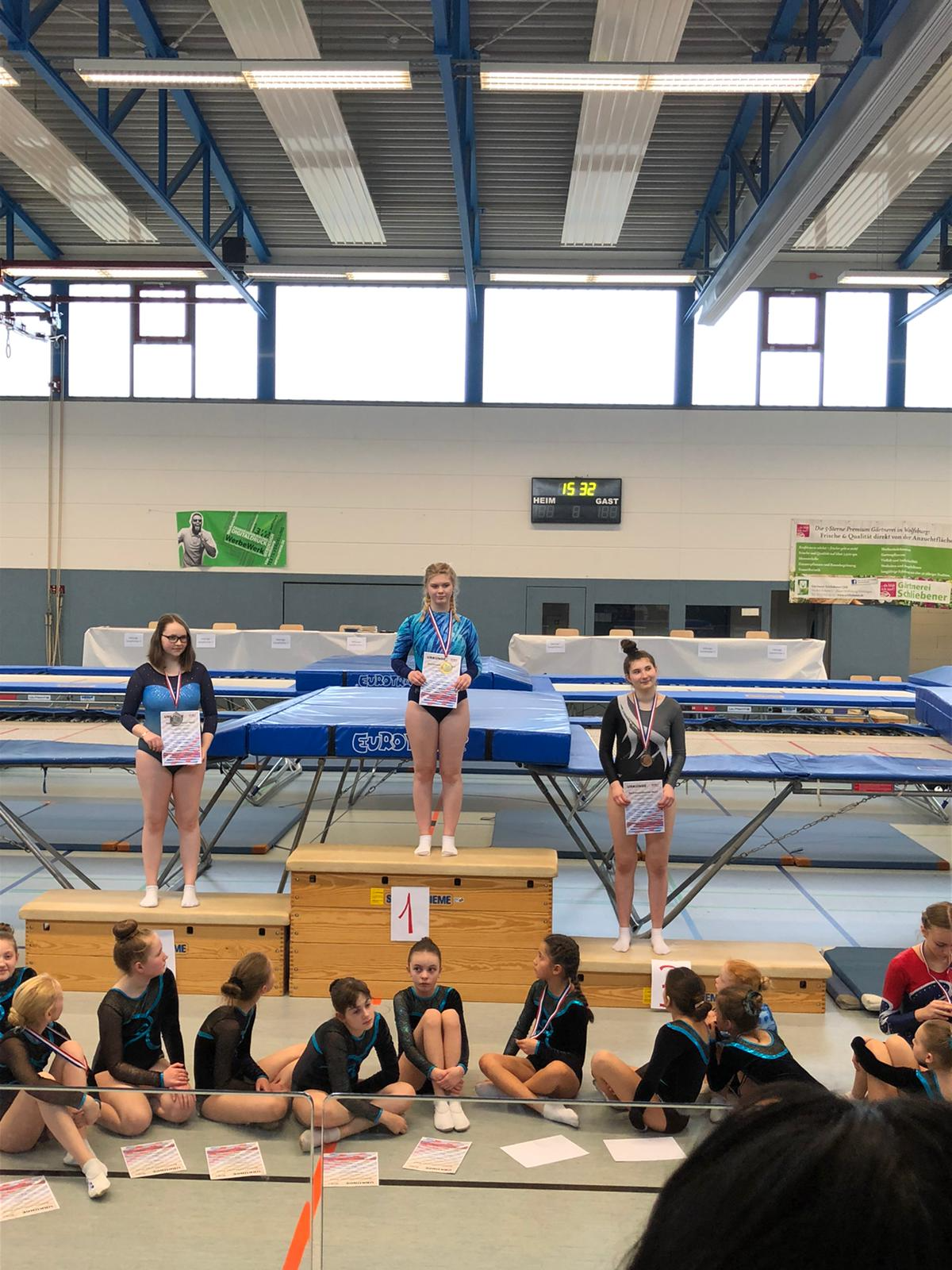 Die größte Truppe ging in der Altersklasse 2002 an den Start. Hier lieferten sich die Turnerinnen der Brunonen einen harten vereinsinternen Kampf, den am Ende Jamie Ahrend mit Platz 5 vor Laura Gerditschke Platz 6 und Wettkampfneuling Charline Uschkurat auf Platz 7 für sich entschied.