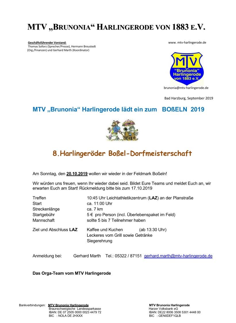 Bitte bildet Eure Teams und meldet Euch bis spätestens 17.10.2019 am. Weitere Einzelheiten findet Ihr in den beigefügten Anlagen. Wir würden uns über Eure Teilnahme freuen. Herzlich willkommen! Mit den besten Grüßen Im Auftrage des MTV Orga-Teams Gerhard Marth MTV „Brunonia“ Harlingerode von 1883 e.V. Vorsitzender (Koordinator)