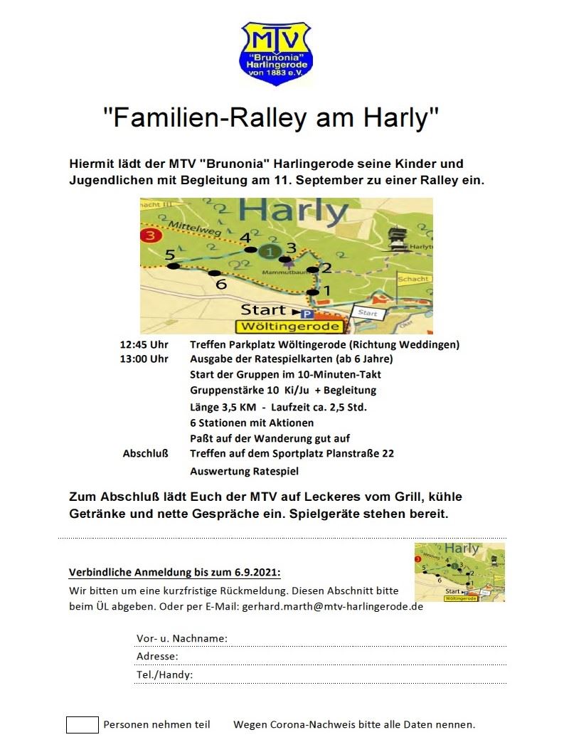 Familien-Ralley am Harly" Hiermit lädt der MTV "Brunonia" Harlingerode seine Kinder und Jugendlichen mit Begleitung am 11. September zu einer Ralley ein.