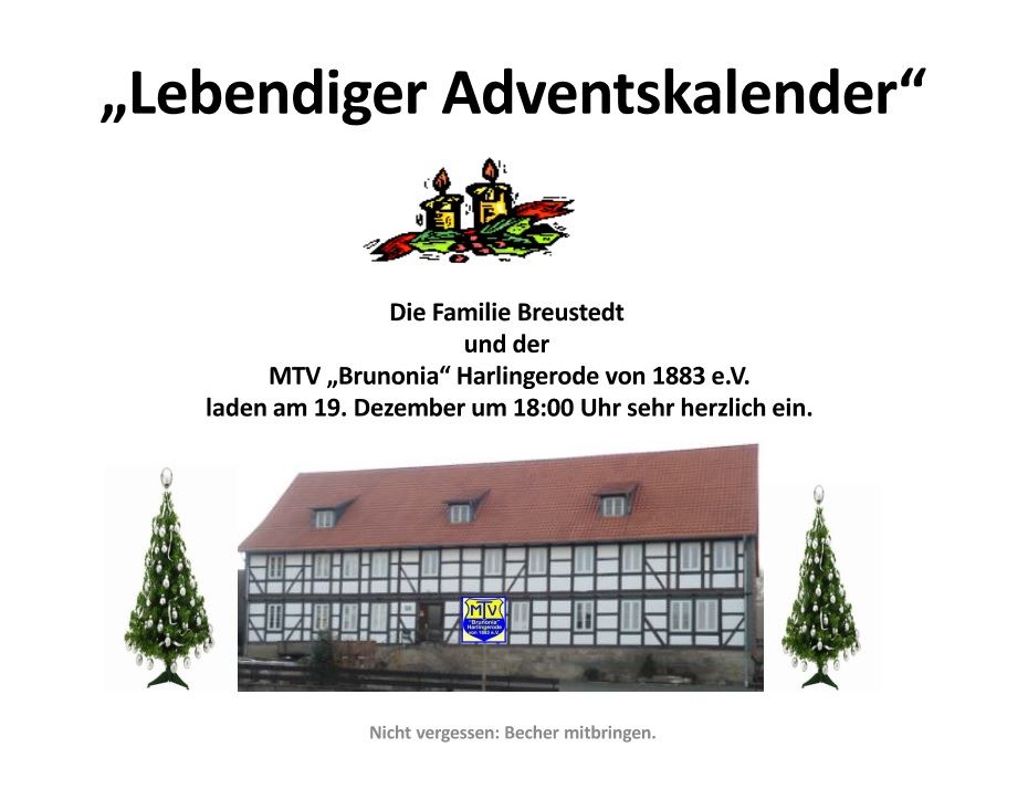 Alljährlich beteiligt sich der „MTV Harlingerode zusammen mit der Fam. Breustedt“ am traditionellen Lebendigen Adventskalender in Harlingerode. 60 bis 70 Menschen kamen am Donnerstag auf dem Hof der Fam. Breustedt zusammen. In seinem Grußwort kündigte MTV-Vorsitzender Hermann Breustedt gleich eine musikalische Änderung an. Karin Arends begleitete mit ihrer Drehorgel die kleine Feierstunde. Eingerahmt von div. Weihnachtsliedern gab Brunhilde wieder zwei lustige Geschichten zum Besten. Bei netten Gesprächen konnte man Glühwein, Kekse und Elas berühmte Schmalzbrote genießen. Mit einem großen Schlusskreis endete die gelungene Veranstaltung. „Gehe hin in Frieden“.